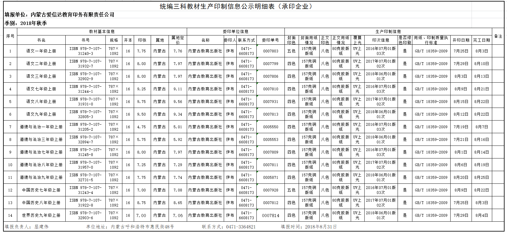 统编三科教材生产印制信息公示明细表 (承印企业)